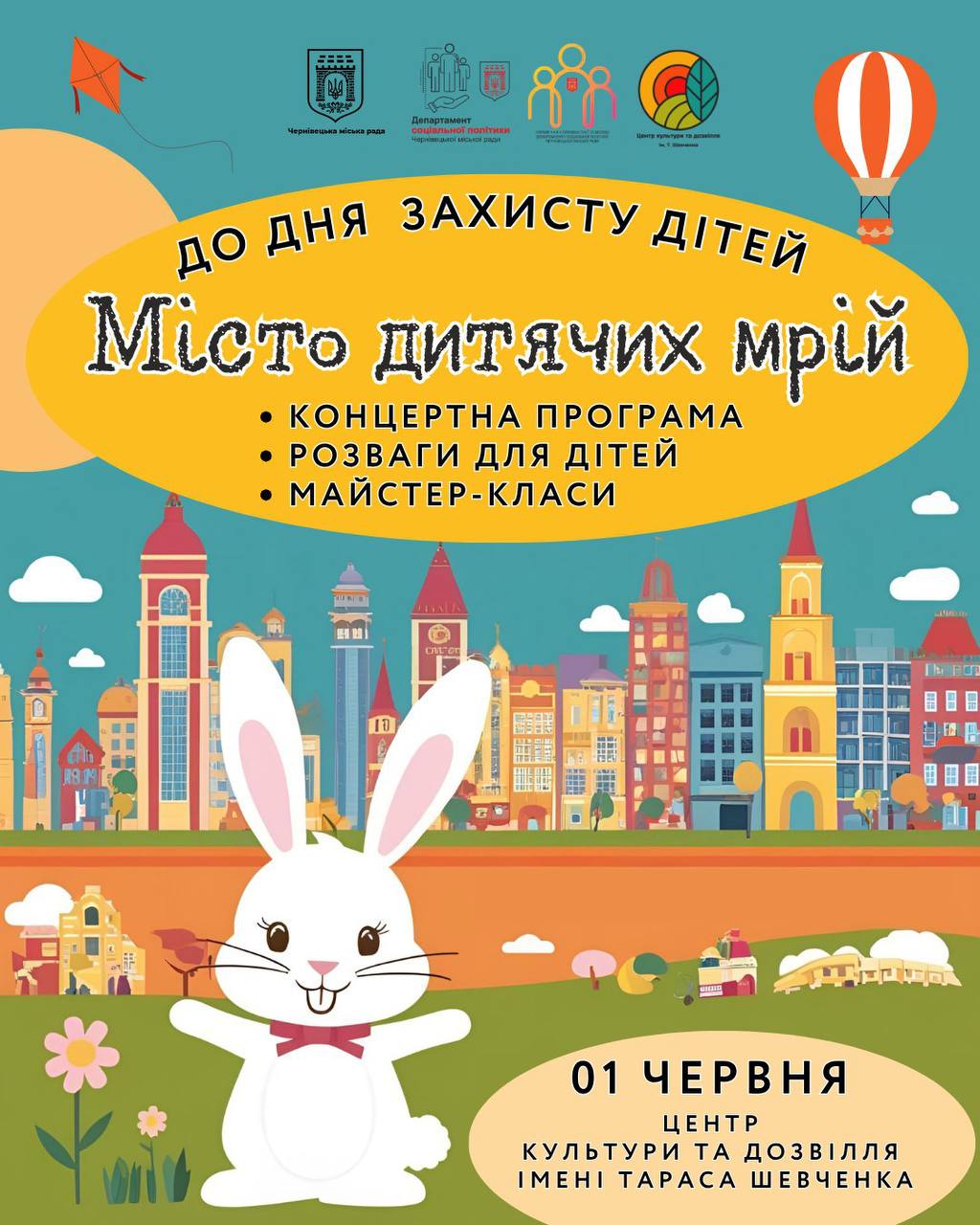 У неділю, 1 червня, в Чернівцях відбудеться святковий захід «Місто дитячих мрій», приурочений до Міжнародного дня захисту дітей. Подія розпочнеться о 13:00 біля Центру культури та дозвілля імені Тараса Шевченка (вул. Садова, 1, поблизу фонтана).