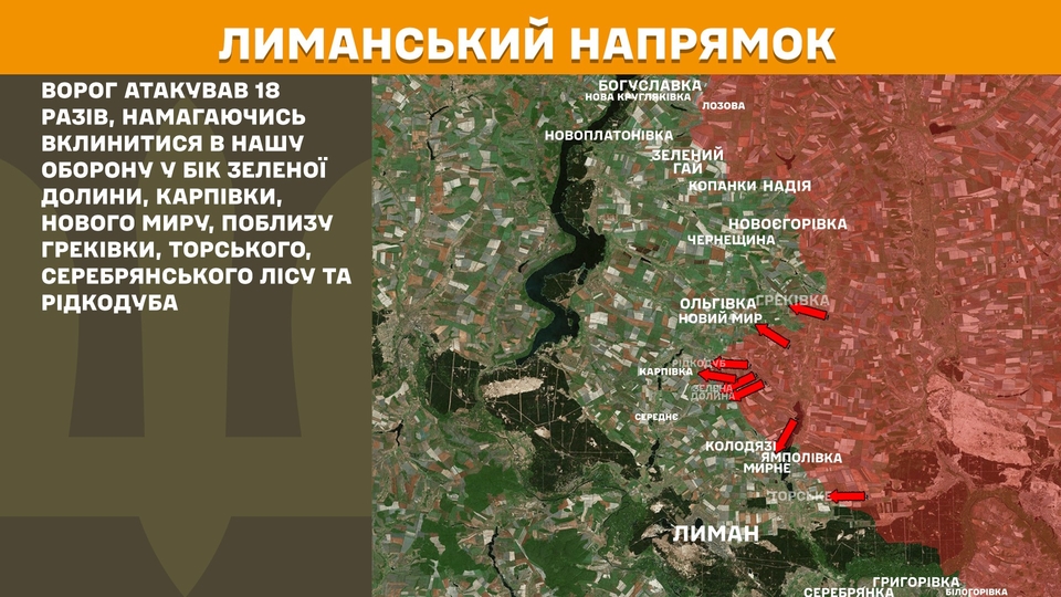 На Лиманському напрямку ворог атакував 18 разів, намагаючись вклинитися в оборону в бік Зеленої Долини, Карпівки, Нового Миру, поблизу Греківки, Торського, Серебрянського лісу та Рідкодуба.
