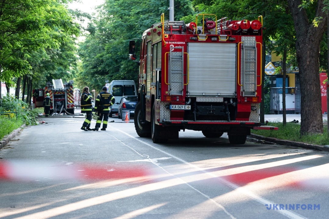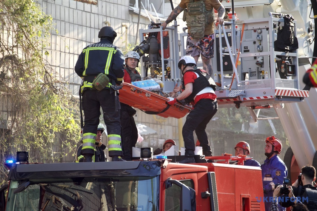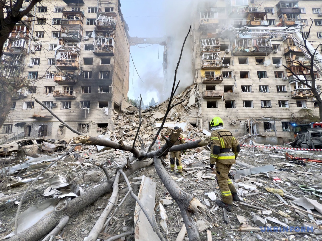 У Солом’янському районі внаслідок влучання ракети у дев’ятиповерхівку повністю зруйновано один під’їзд. Існує загроза обвалення конструкцій. Під завалами можуть перебувати люди. Знищено 8 авто, ще 4 горіли у дворі.
