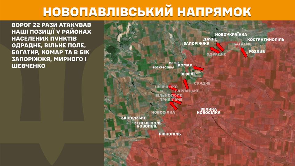 На Новопавлівському напрямку ворог 22 рази атакував у районах Одрадного, Вільного Поля, Багатиря, Комара та в бік Запоріжжя, Мирного і Шевченко.