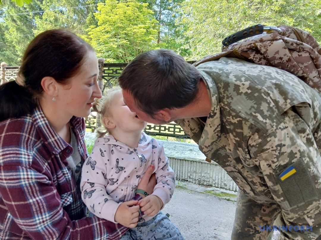 Поки знайомлюся з її батьками – Владиславом та Наталією Петренками з Любарської громади Житомирської області, малеча бігає довкола нас. У якийсь момент тато з усмішкою каже: «Дарино, якщо не будеш слухатися, відправлю до свого комбата. Він тебе навчить дисципліни». Потім бере доньку на плечі, вона ніжно гладить його волосся.