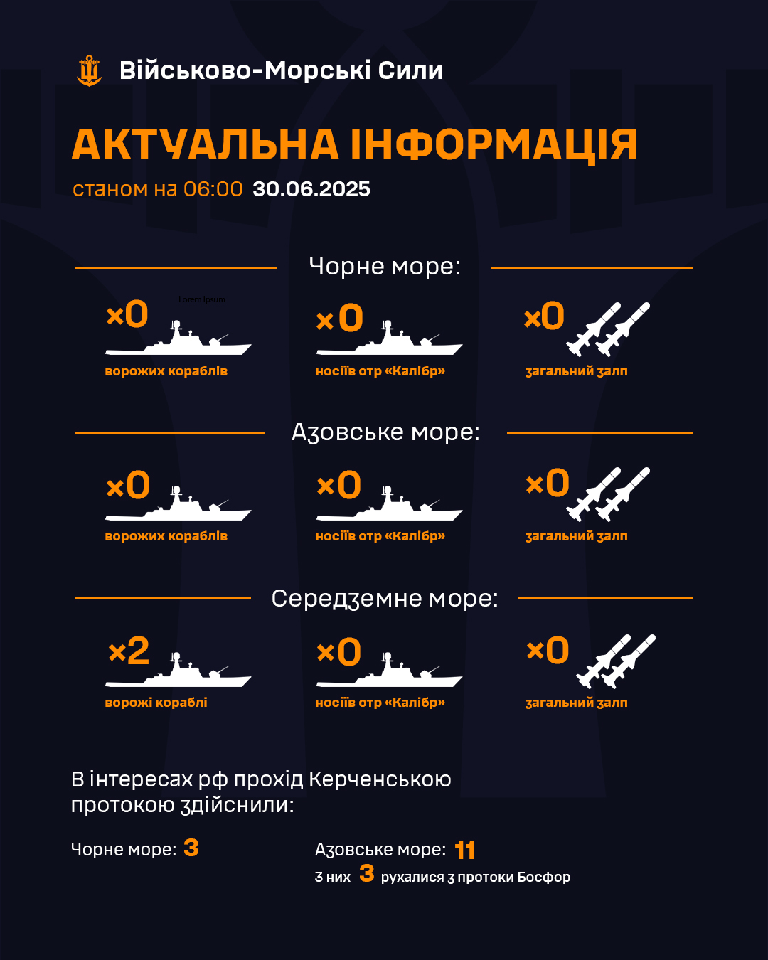 Про це ВМС України повідомляють в оперативній інформації станом на 06:00 30.06.2025 у Фейсбуці, передає Укрінформ.