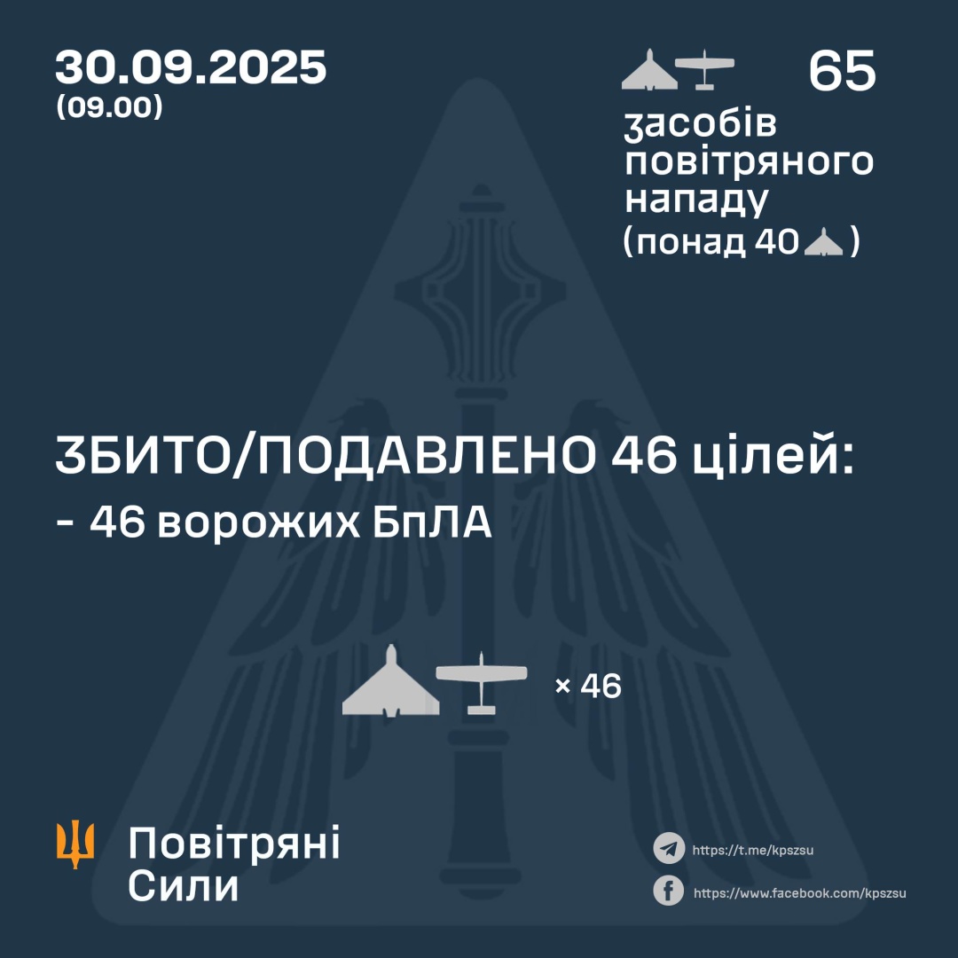 За попередніми даними, станом на 09:00 вівторка, 30 вересня, протиповітряна оборона збила / подавила 46 БПЛА на півночі, півдні, сході та в центрі країни.