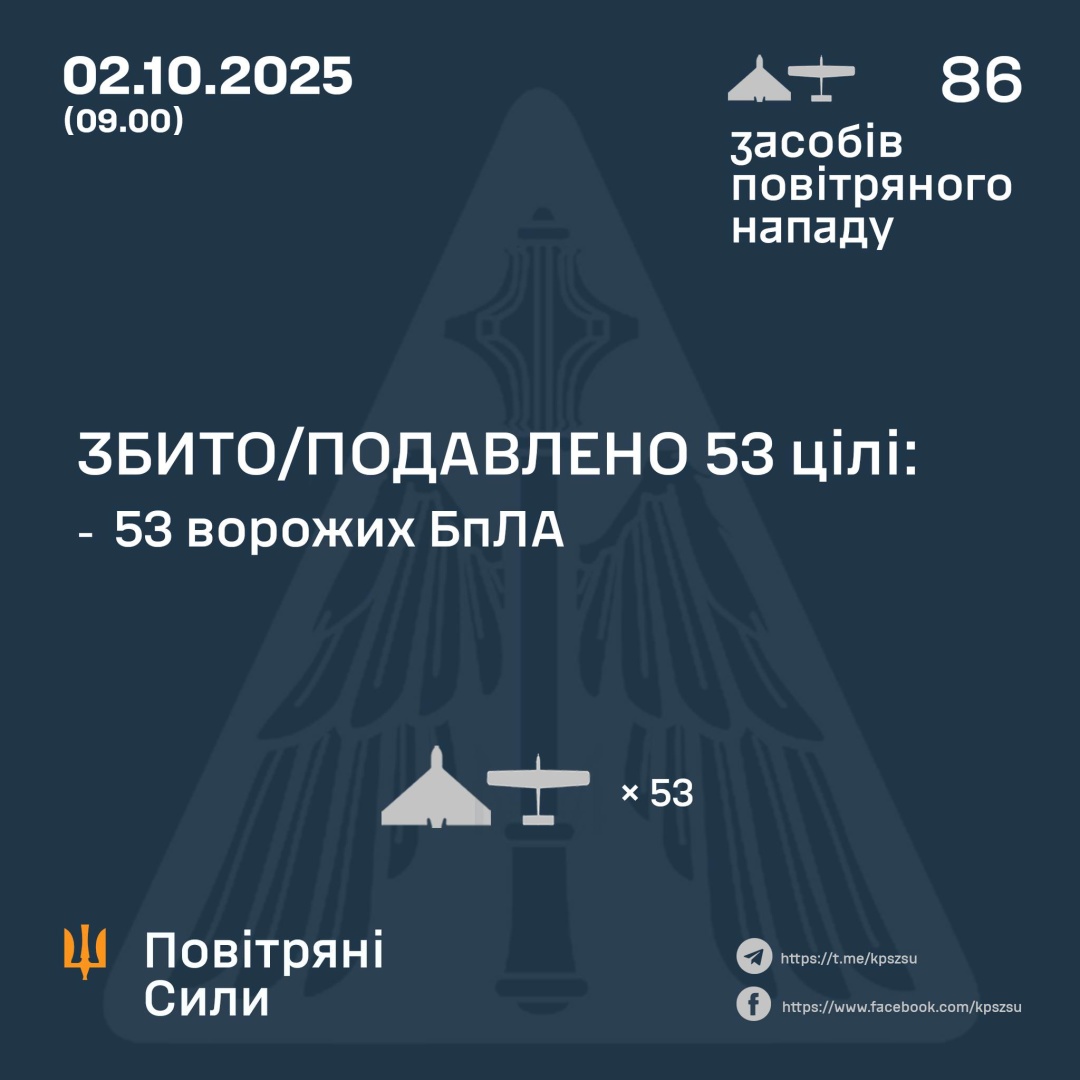 Сили протиповітряної оборони знешкодили 53 із 86 російських безпілотників.