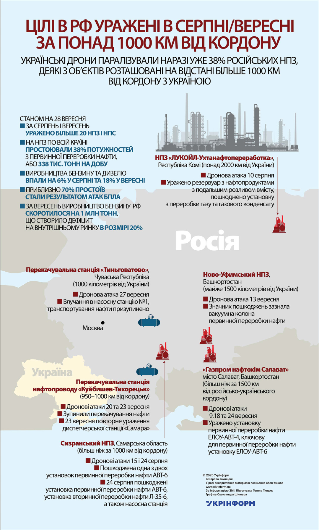 Цілі в РФ уражені в серпні/вересні за понад 1000 км від кордону