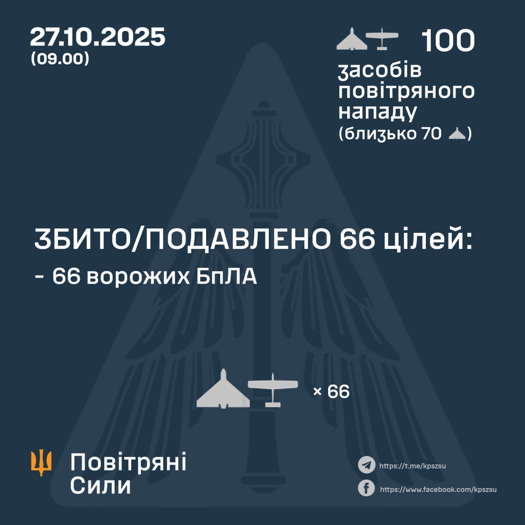 Протиповітряна оборона знешкодила 66 російських дронів різних типів зі ста запущених Росією з вечора 26 жовтня.