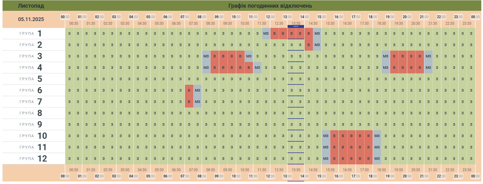 У графіку погодинних відключень відображають години гарантованого включення електроенергії (зелені клітинки) та години, коли ваші оселі будуть точно знеструмлені (позначені червоним кольором).