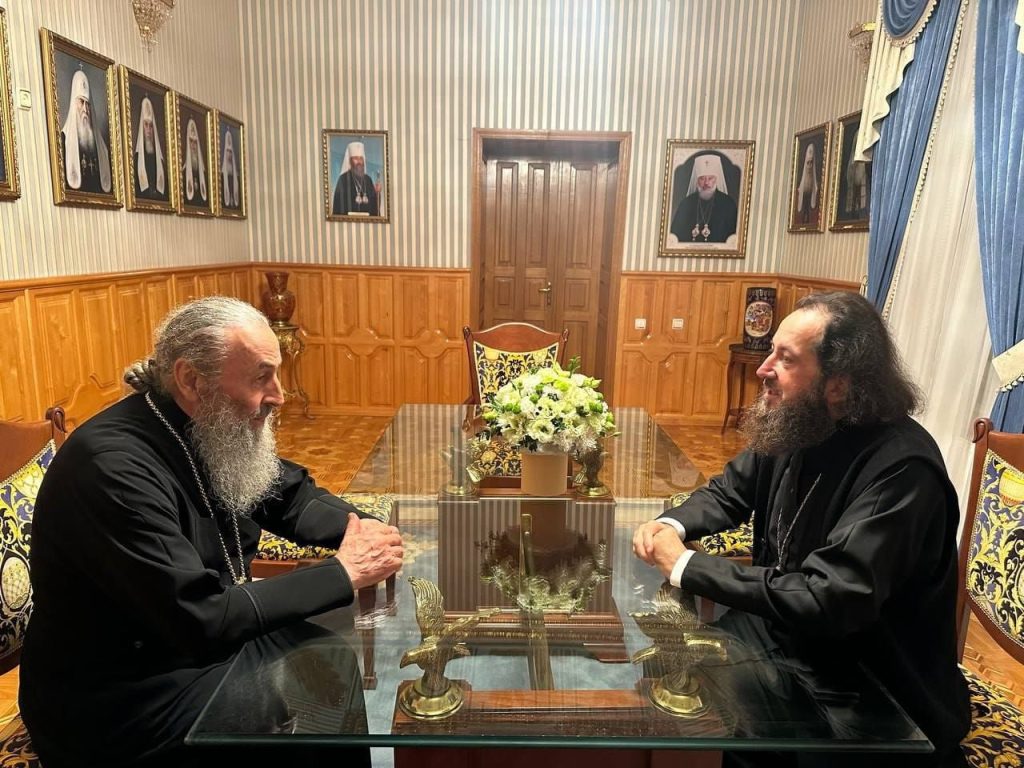 Митрополит Онуфрій із соратником Кирила Гундяєва владикою Петру Мустяце в Одесі під портретами московських патріархів (вересень 2024 року)