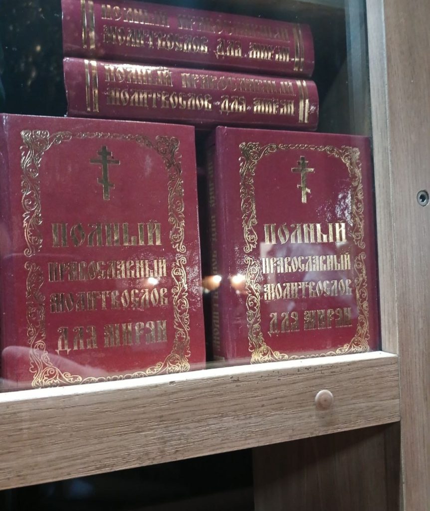 Молитовники до символів російської великодержавности (на вітрині крамниці у Свято-Духівському соборі в Чернівцях, весна 2025 року)