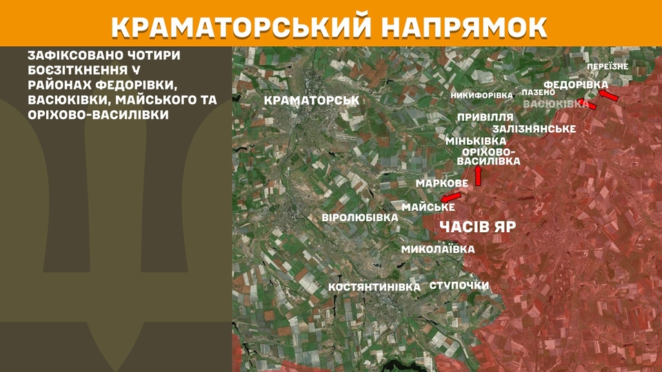 На Краматорському напрямку зафіксовано чотири боєзіткнення у районах Федорівки, Васюківки, Майського та Оріхово-Василівки.
