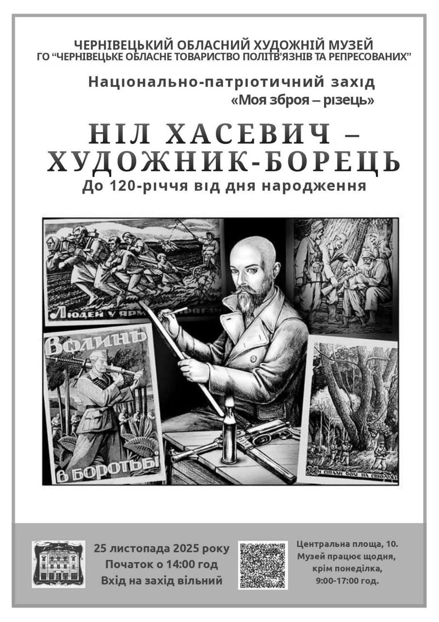 25 листопада Чернівецький обласний художній музей запрошує відвідати національно-патріотичний захід та виставку, присвячені 120-річчю від дня народження Ніла Хасевича — видатного українського художника-графіка, громадсько-політичного діяча та учасника національно-визвольного руху ХХ століття.