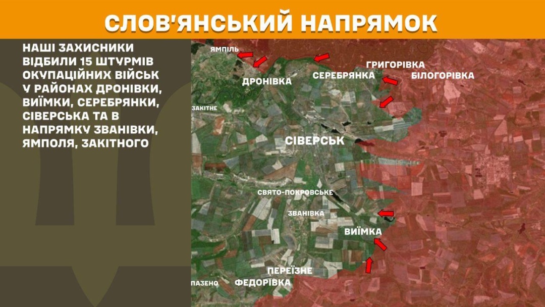 На Слов’янському напрямку українські захисники відбили 15 штурмів у районах Дронівки, Виїмки, Серебрянки, Сіверська та в напрямку Званівки, Ямполя, Закітного.