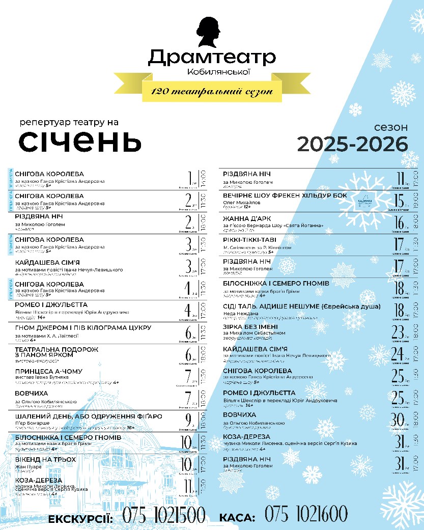 Чернівецький обласний академічний музично-драматичний театр оприлюднив афішу вистав на січень.