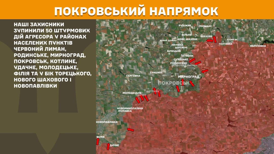 На Покровському напрямку наші захисники зупинили 50 штурмових дій агресора в районах населених пунктів Червоний Лиман, Родинське, Мирноград, Покровськ, Котлине, Удачне, Молодецьке, Філія та у бік Торецького, Нового Шахового і Новопавлівки.