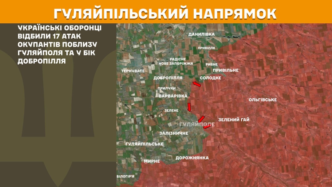 На Гуляйпільському напрямку українські оборонці відбили 17 російських атак поблизу Гуляйполя та у бік Добропілля.