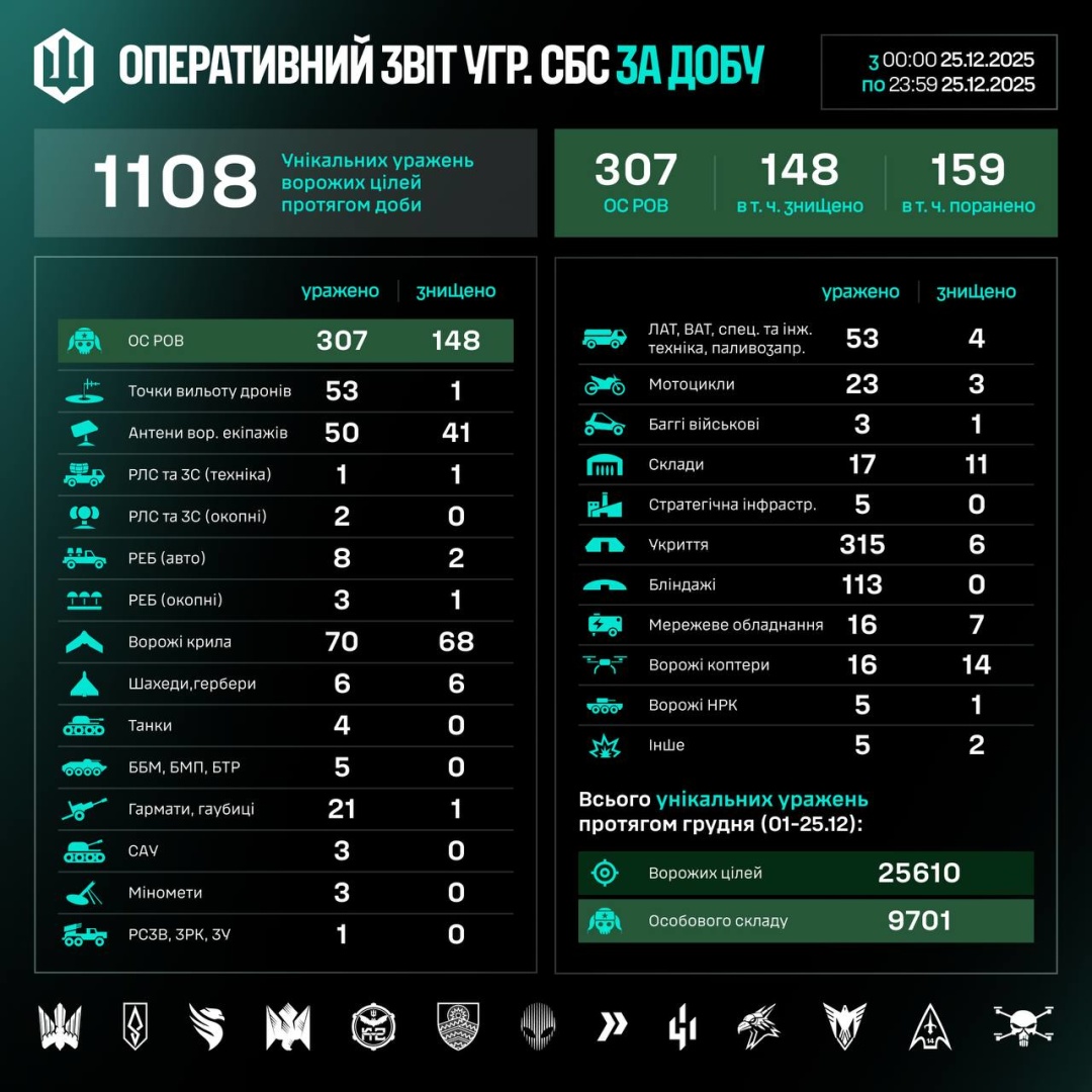 Загалом упродовж грудня (01–25.12) знищено/уражено 25610 цілей, з них – 9701 особовий склад противника, зазначили в СБС.