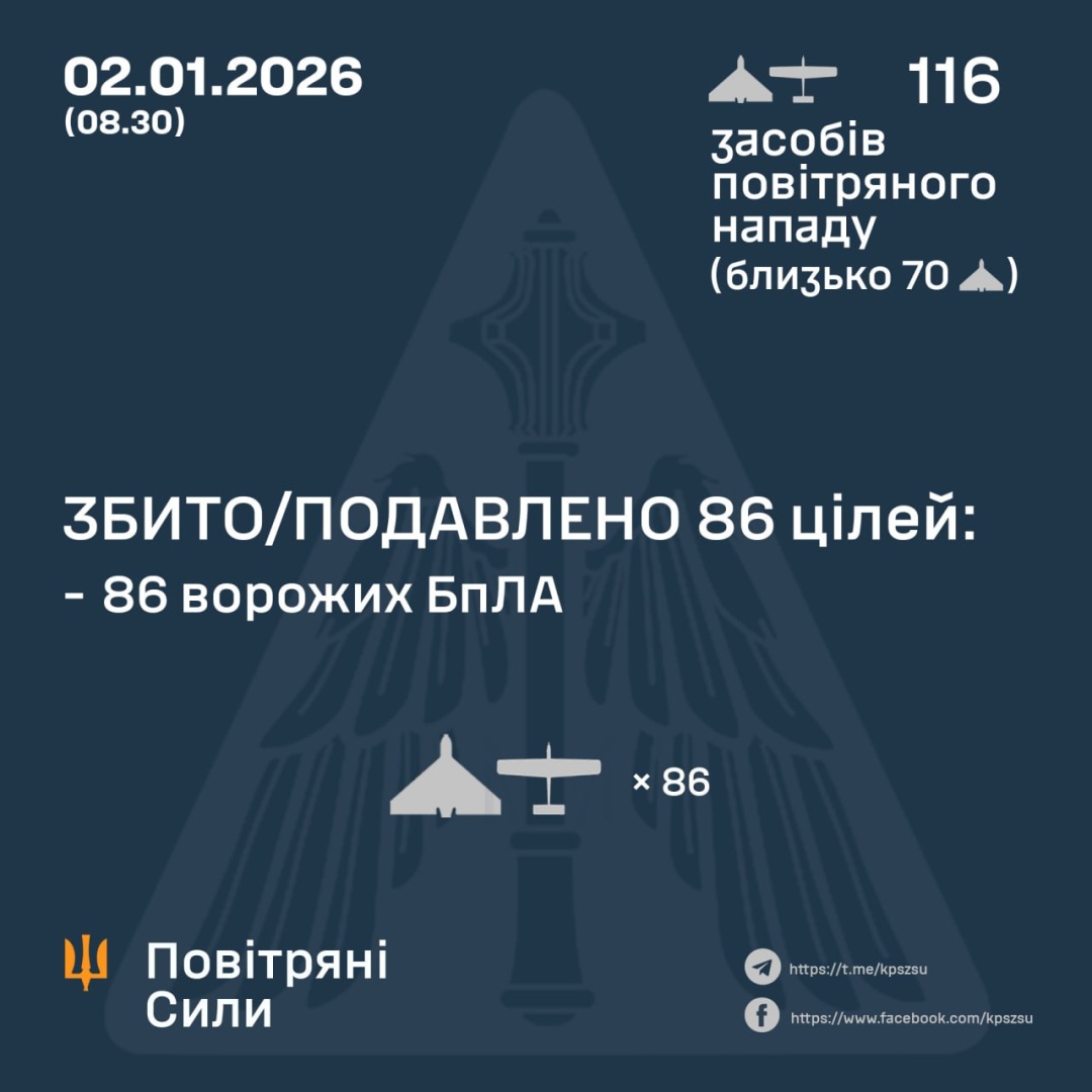 За попередніми даними, станом на 08:30 п’ятниці, 2 січня, ППО збила/подавила 86 дронів інших типів на півночі, півдні та сході України.