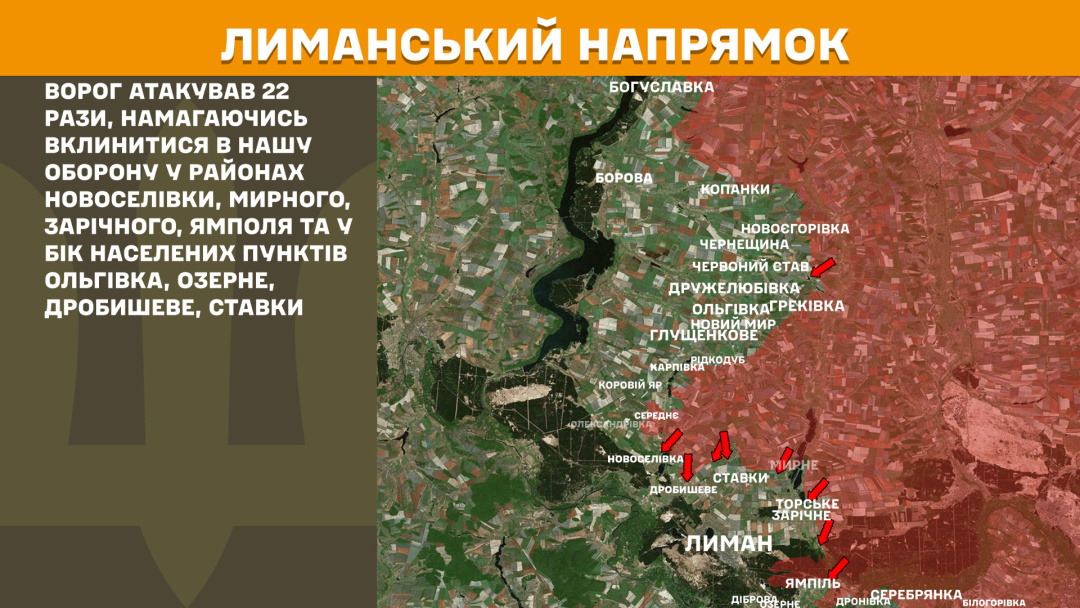 На Лиманському напрямку загарбники атакували 22 рази, намагаючись вклинитися в оборону у районах Новоселівки, Мирного, Зарічного, Ямполя та у бік населених пунктів Ольгівка, Озерне, Дробишеве, Ставки.