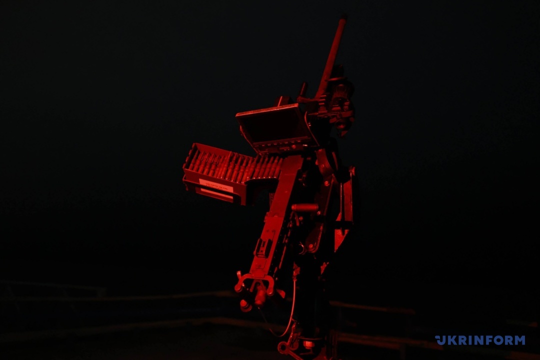Хлопці саме налаштовують американський великокаліберний кулемет М2 Browning. Діляться, що роблять це завжди, незалежно від того, чи зафіксовані цілі в зоні їхньої відповідальності. Через підвищену вологість, бризки солоної води зброю необхідно постійно чистити та змащувати. Володимир зазначає: буває, за ніч розрахунок вистрілює до двох тисяч патронів.