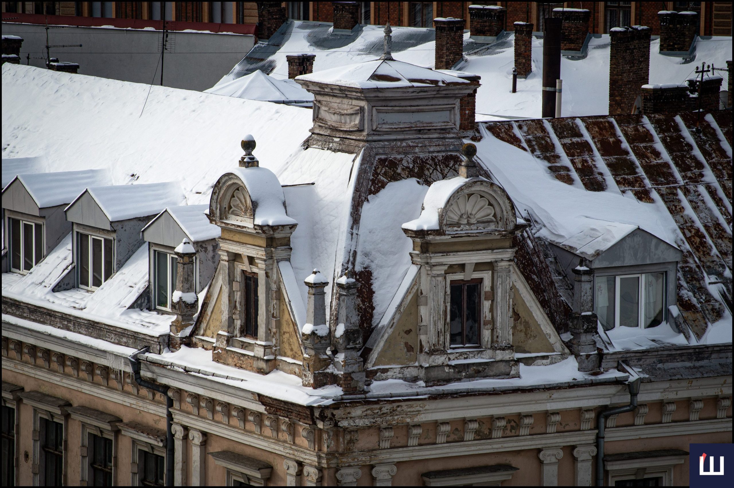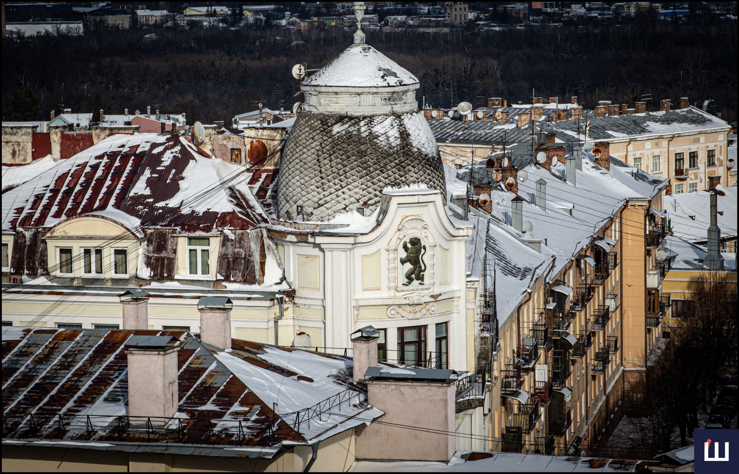 Сніг ліг на черепичні та металеві покрівлі, димарі, куполи храмів і вузькі вулиці, що добре видно з висоти.