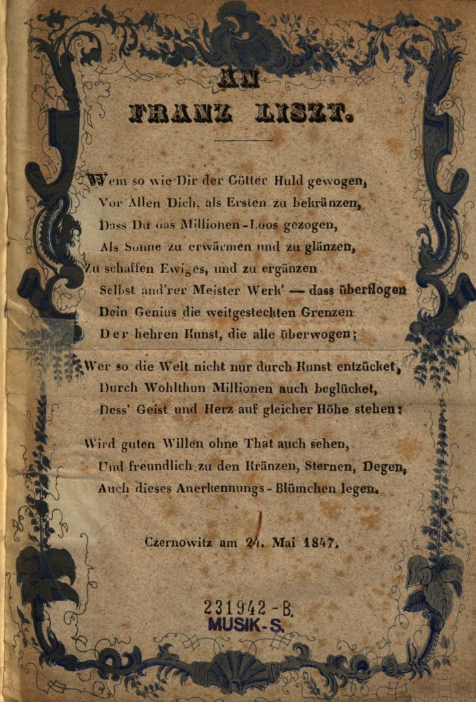 Вірш-присвята Ференцу Лісту, з приводу його гастролей у Чернівцях, 1847 рік (з фондів Австрійської Національної бібліотеки)