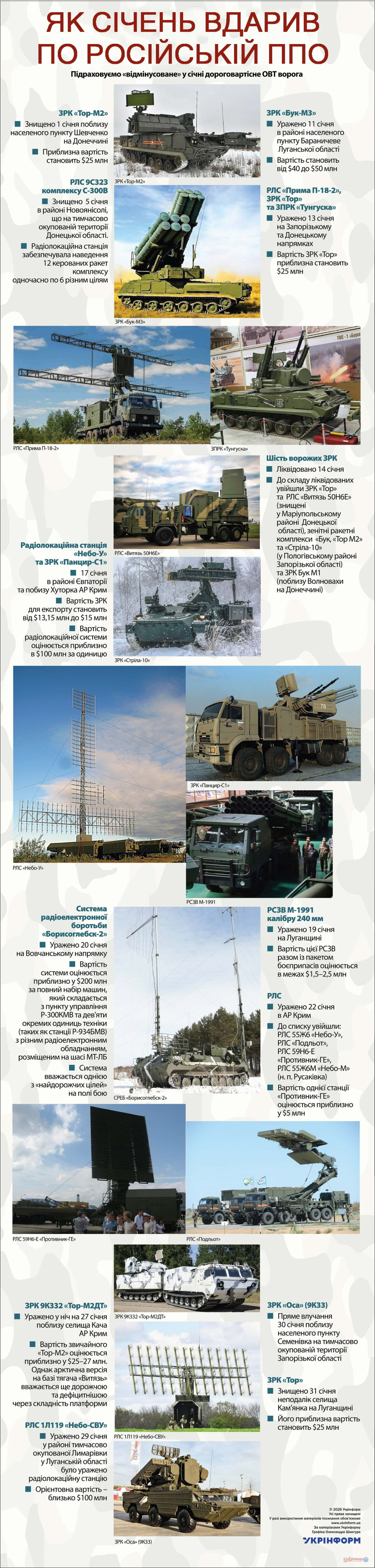 Як січень вдарив по російській ППО 16.02.2026 11:00 Укрінформ Підраховуємо «відмінусоване» у січні дороговартісне ОВТ ворога За матеріалами Укрінформу     Новини з передової