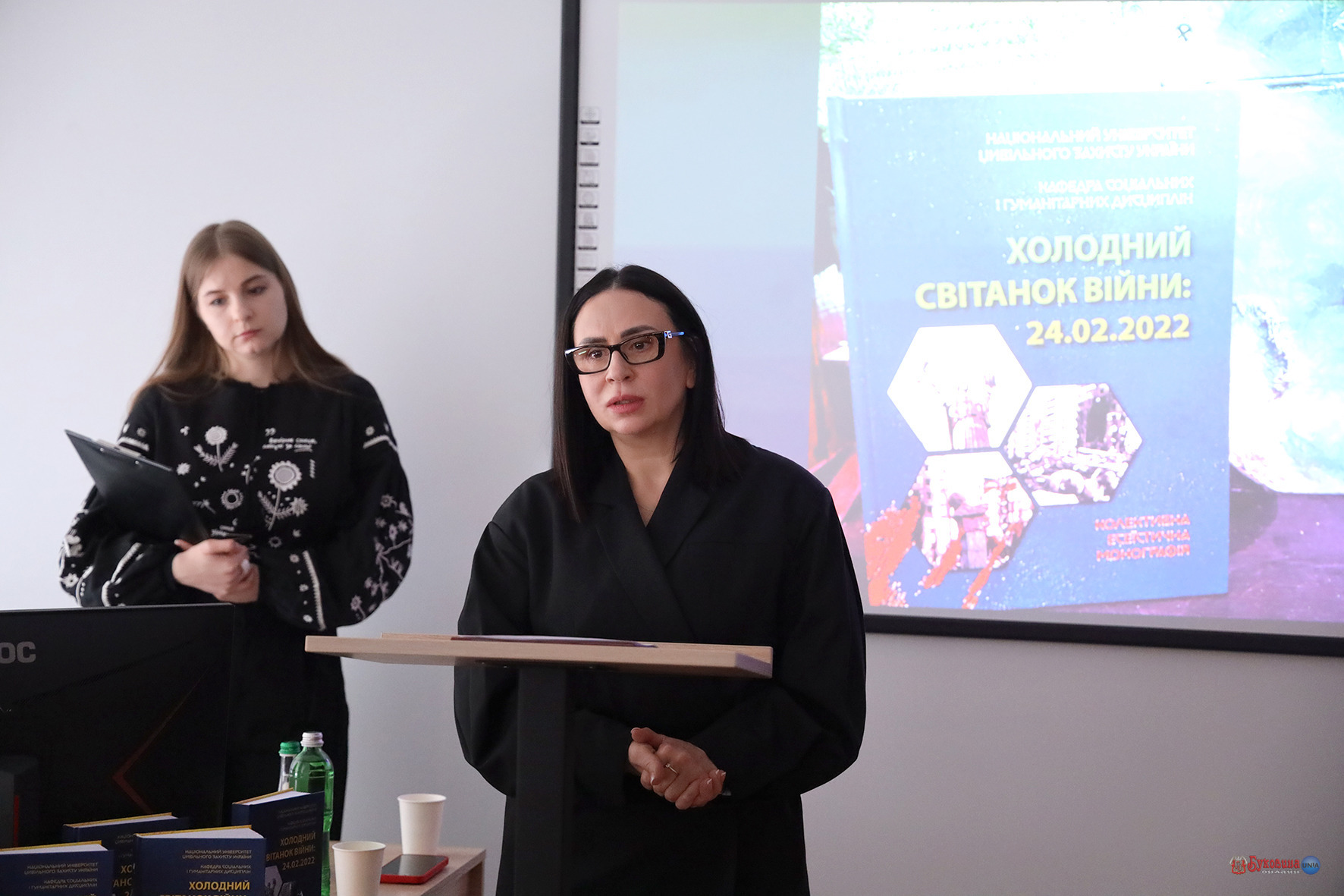 Аудиторія, в якій відбувалася презентація монографії, була оформлена з особливою делікатністю та глибоким символізмом. Простір наповнювали тематичні інсталяції – стримані, продумані до деталей, вони відтворювали атмосферу того тривожного ранку, коли звичний світ розділився на «до» і «після».