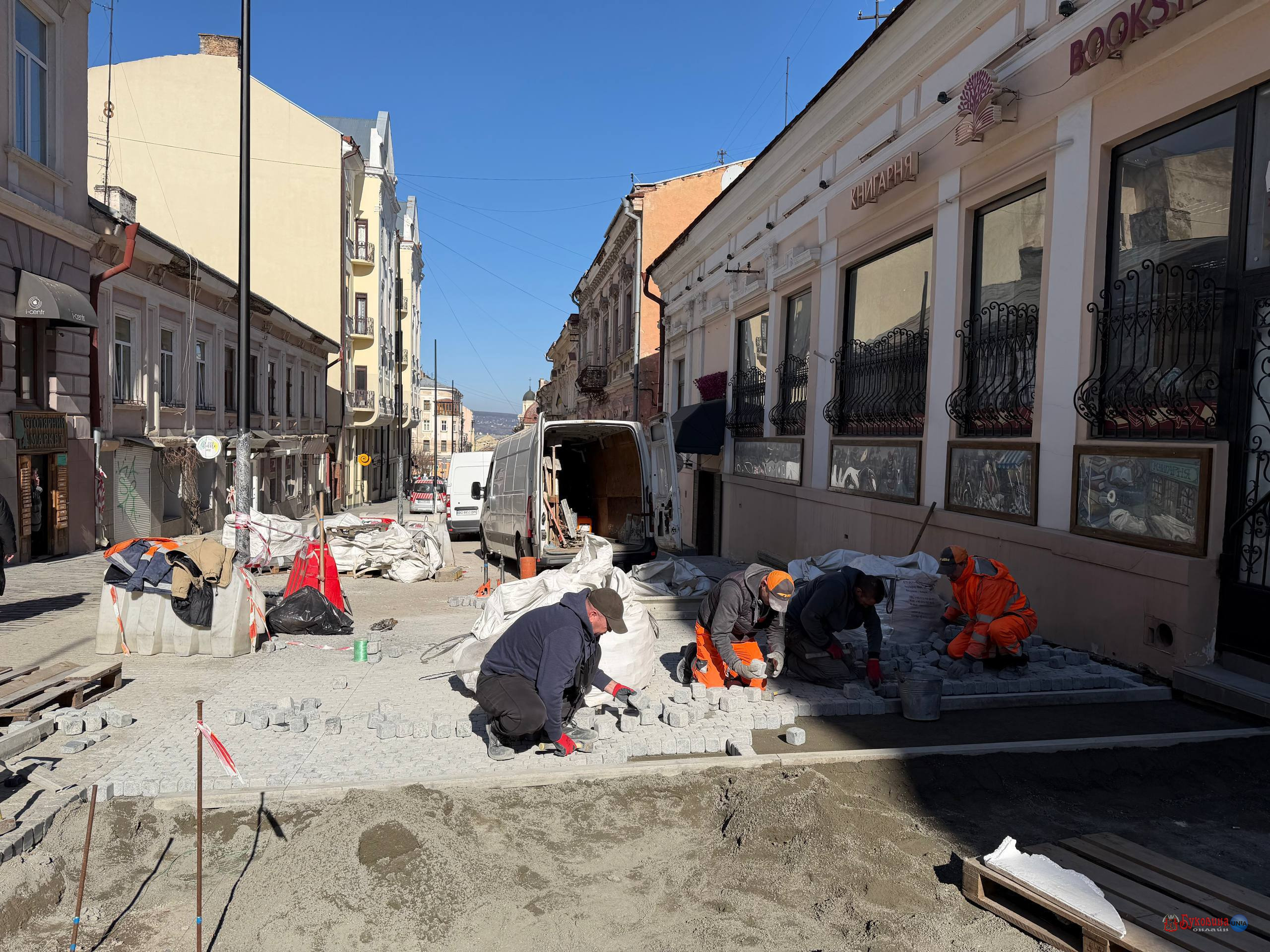 На вулиці Марії Заньковецької підрядники поновили ремонтні роботи. Зараз вони вкладають бруківку.