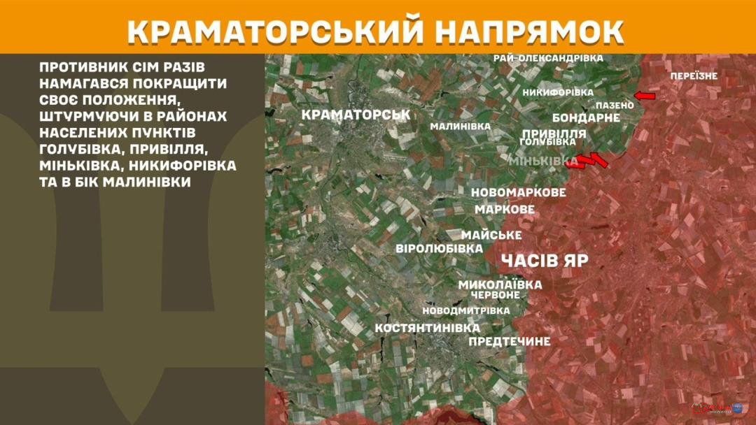 На Краматорському напрямку війська РФ сім разів намагалися покращити своє положення, штурмуючи в районах Голубівки, Привілля, Міньківки, Никифорівки та в бік Малинівки.