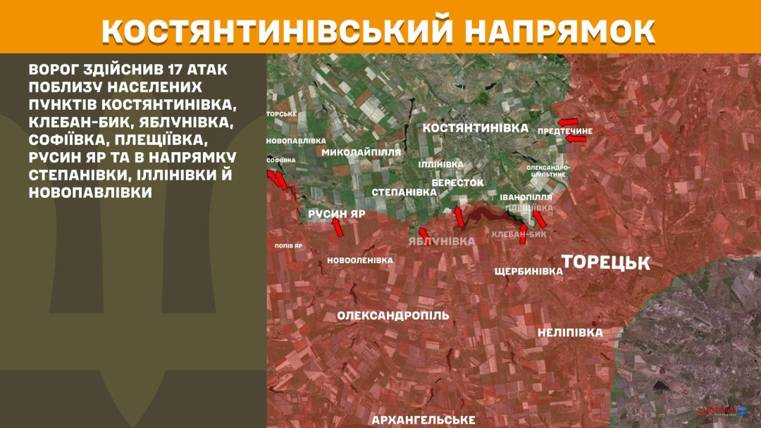 На Костянтинівському напрямку росіяни здійснили 17 атак поблизу населених пунктів Костянтинівка, Клебан-Бик, Яблунівка, Софіївка, Плещіївка, Русин Яр та в напрямку Степанівки, Іллінівки й Новопавлівки.