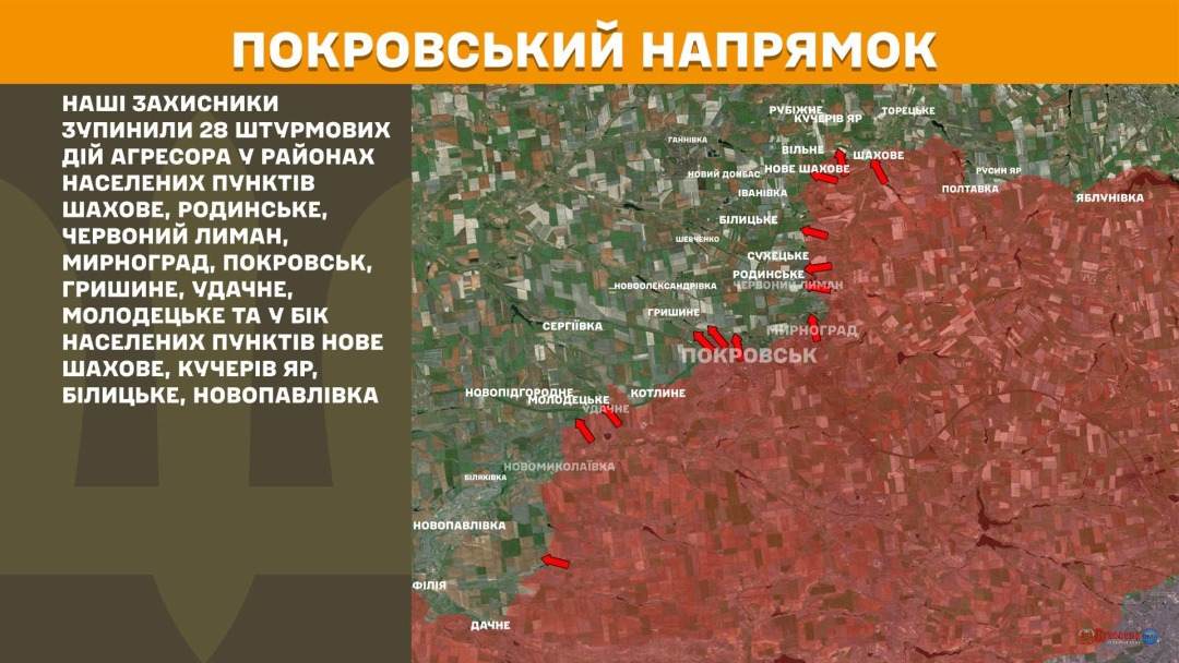 На Покровському напрямку українські захисники зупинили 28 штурмових дій армії РФ у районах населених пунктів Шахове, Родинське, Червоний Лиман, Мирноград, Покровськ, Гришине, Удачне, Молодецьке та у бік населених пунктів Нове Шахове, Кучерів Яр, Білицьке, Новопавлівка.