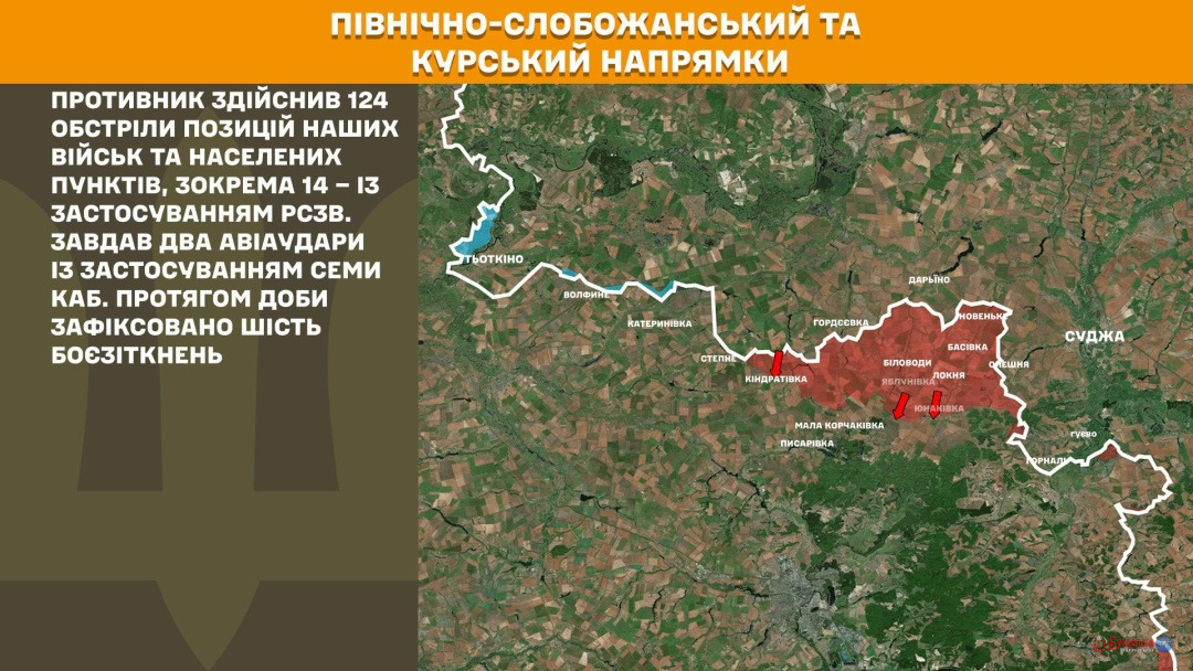 На Північно-Слобожанському і Курському напрямках росіяни здійснили 124 обстріли позицій українських військ та населених пунктів, зокрема 14 – із застосуванням РСЗВ. Завдали два авіаудари із застосуванням семи КАБів. Протягом доби зафіксовані шість боєзіткнень.