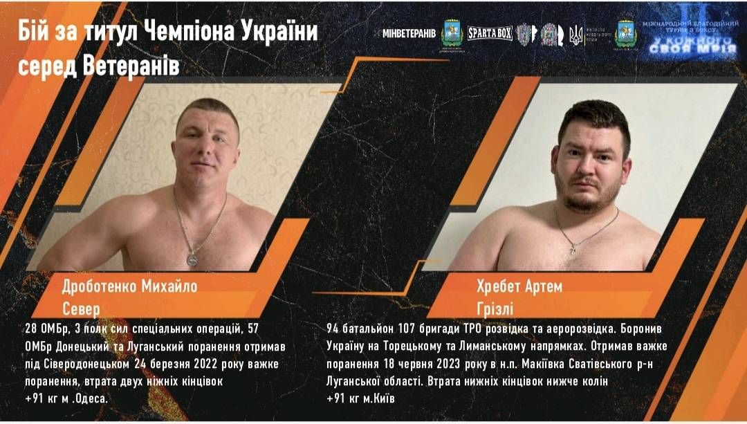 Боєць чернівецької тероборони переміг в першому світі поєдинку, котрий відбувся між боксерами з подвійними ампутаціями нижніх кінцівок. Артем Хребет під позивним «Грізлі» і його суперник Михайло Дроботенко, позивний «Сєвєр», – ветерани, котрі після травм стали на протези та повернулися до життя й спорту.