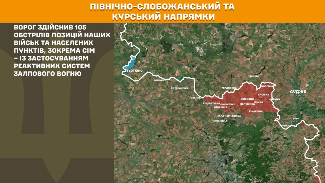 На Північно-Слобожанському і Курському напрямках російські війська здійснили 105 обстрілів позицій українських військ та населених пунктів, зокрема сім із застосуванням реактивних систем залпового вогню.