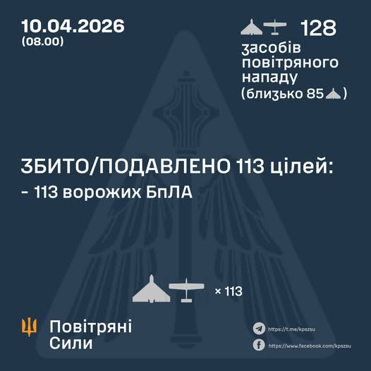 Сили ППО знешкодили 113 зі 128 російських дронів 10.04.2026 08:11 Укрінформ Протиповітряна оборона знешкодила 113 безпілотників, якими російські війська атакували Україну з минулого вечора.