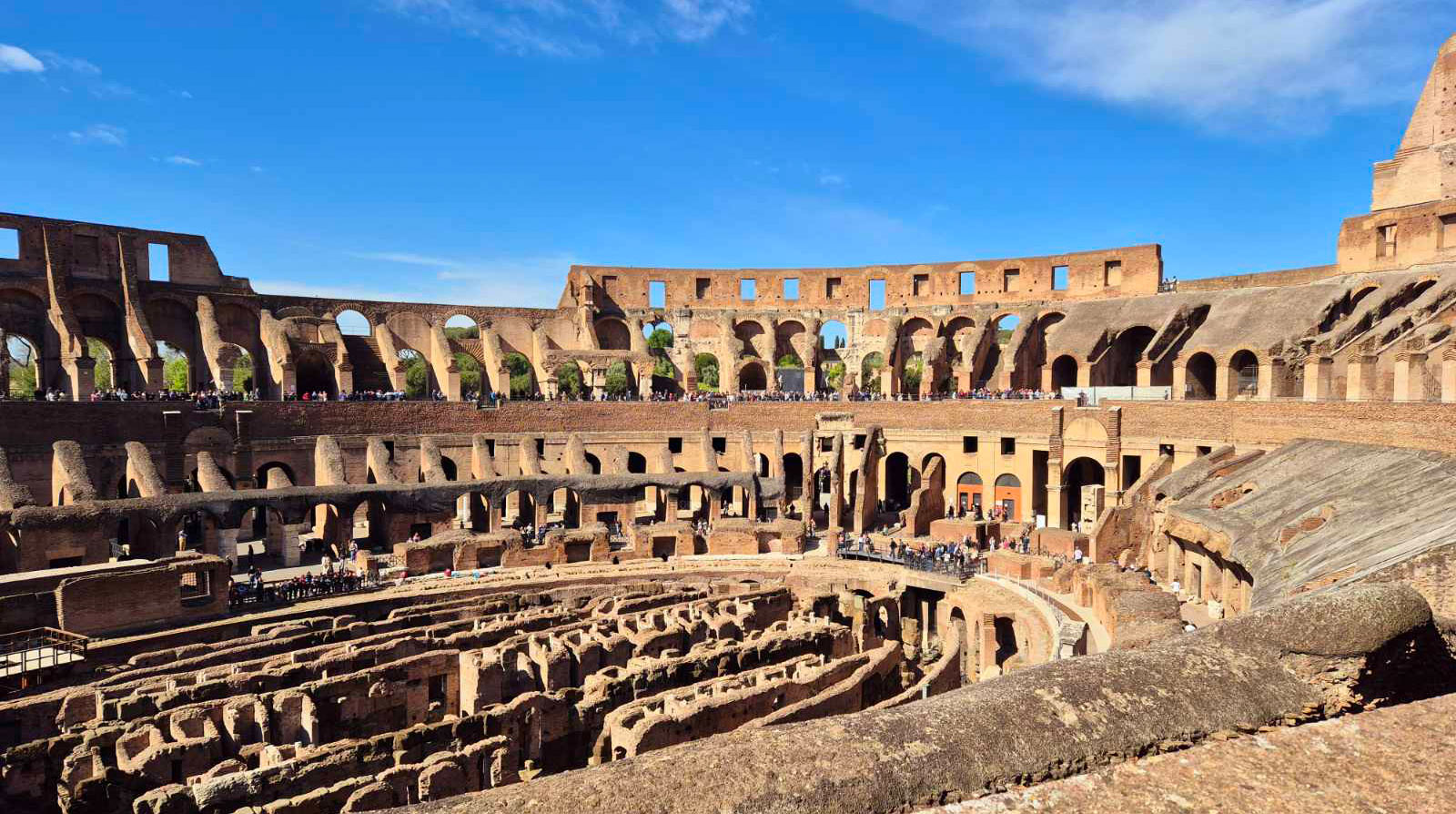 Більшість людей уявляє Колізей як цілу арену з піском. Але те, що бачиш зараз, – це відкрита яма посередині, де колись і був той пісок, а під ним – відкриті підземні коридори, де тримали тварин і гладіаторів перед виходом. Підлогу розібрали ще в середні віки, і тепер дивишся вниз крізь ці кам’яні нутрощі і розумієш, що тут відбувалося механічно, а не тільки символічно.
