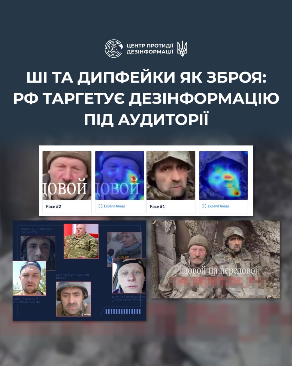 Дослідники виявили понад 1000 синтетичних відео, які є частиною так званого «ланцюга знищення наративів» — модульної системи атак, адаптованої під різні цільові аудиторії. У роликах для військових увагу зосереджують на «марності боротьби», «краху фронту», дискредитації військового командування тощо.