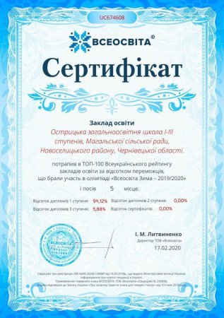 Ось уже кілька років поспіль проєкт «Всеосвіта» проводить сезон учнівських олімпіад. Цьогоріч було організовано 25 цікавих предметних олімпіад для учнів 1 – 11 класів. Зміст усіх завдань відповідав шкільній програмі середньої школи, а рівень складності був доступний всім учням. Учасники мали можливість відповідати на завдання у режимі онлайн та офлайн. Перевірка відбувалась автоматично, після внесення вчителем відповідей на сайті, інформують у відділі освіти РДА. Школи району та ОТГ також долучились до олімпіад, а два ЗЗСО – Тарасосецька ЗОШ (4 місце) та Острицька ЗОШ (5 місце) потрапили в ТОП-100 Всеукраїнського рейтингу закладів освіти за кількістю переможців, що брали участь в олімпіаді «Всеосвіта Зима – 2019/2020». Дякуємо за участь!