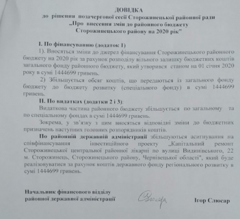 Це пов’язано з збільшенням асигнування в сумі 1,4 млн. грн. на співфінансування інвестиційного проекту “Капітальний ремонт Сторожинецької центральної районної лікарні”, який буде реалізовуватися за рахунок коштів державного Фонду регіонального розвитку.