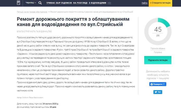 На офіційному сайті Чернівецької міської ради у розділі “Єдина система місцевих петицій” зареєстрували електронне звернення щодо ремонту дорожнього покриття з облаштуванням канав для водовідведення по вул. Стрийській.