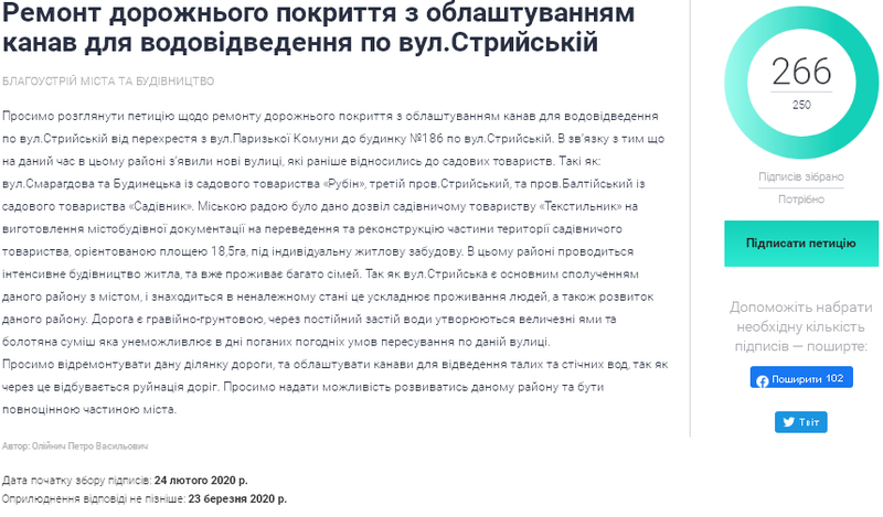 “Просимо розглянути петицію щодо ремонту дорожнього покриття з облаштуванням канав для водовідведення по вул.Стрийській від перехрестя з вул.Паризької Комуни до будинку №186 по вул.Стрийській. В зв’язку з тим що на даний час в цьому районі з’явили нові вулиці, які раніше відносились до садових товариств. Такі як: вул.Смарагдова та Будинецька із садового товариства «Рубін», третій пров.Стрийський, та пров.Балтійський із садового товариства «Садівник». Міською радою було дано дозвіл садівничому товариству «Текстильник» на виготовлення містобудівної документації на переведення та реконструкцію частини території садівничого товариства, орієнтованою площею 18,5га, під індивідуальну житлову забудову. В цьому районі проводиться інтенсивне будівництво житла, та вже проживає багато сімей. Так як вул.Стрийська є основним сполученням даного району з містом, і знаходиться в неналежному стані це ускладнює проживання людей, а також розвиток даного району. Дорога є гравійно-грунтовою, через постійний застій води утворюються величезні ями та болотяна суміш яка унеможливлює в дні поганих погодніх умов пересування по даній вулиці.