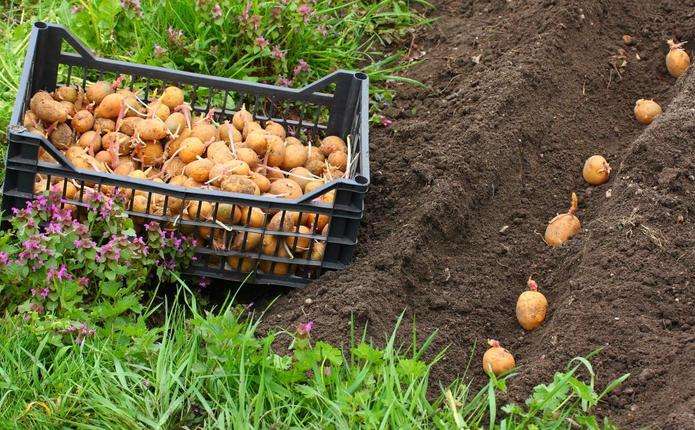 - Картоплини висаджують у невеликі ямки, вириті у місцях надрізів, і злегка присипають їх ґрунтом.