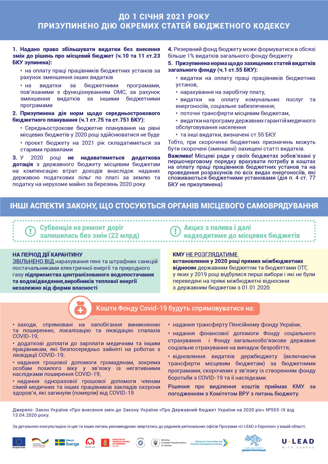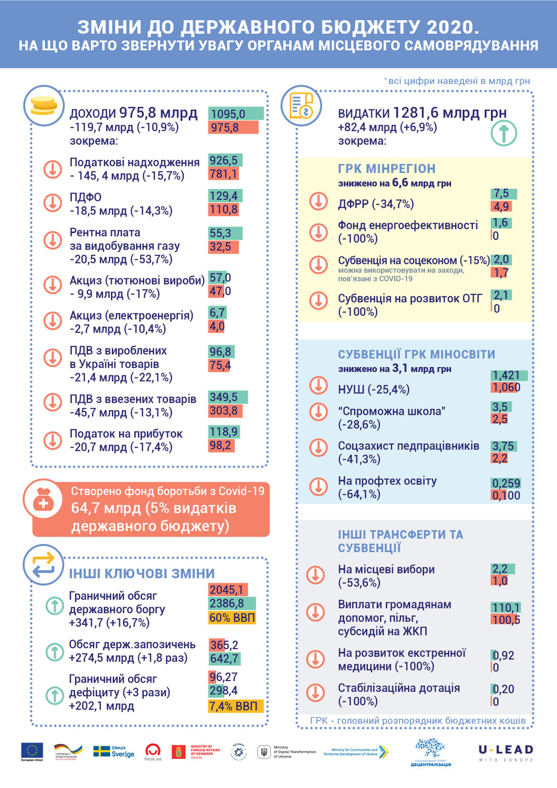 Цього місяця були прийняті зміни до ЗаконуУкраїни «Про Державний бюджет України на 2020 рік» (№533-ІХ від 13.04.2020). Новий бюджет називають «антикризовим», бо ці зміни пов’язані із зовнішніми та внутрішніми викликами, які постали через пандемію та економічну кризу. Фахівці Програми «U-LEADз Європою» розробили інфографіки для пояснення основних змін.