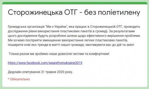 Громадська організація “Ми з України” розпочинає кампанію, в процесі якої буде напрацьовано ефективні шляхи щодо вирішення проблеми високого використання поліетиленових пакетів в Сторожинецькій громаді.