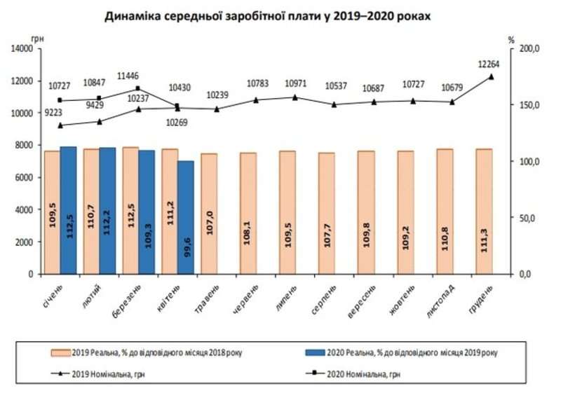 За даними статистичного відомства, реальна зарплата (з урахуванням інфляції) у квітні 2020 року до квітня минулого року скоротилася на 0,4%, номінальна зросла на 1,6%.