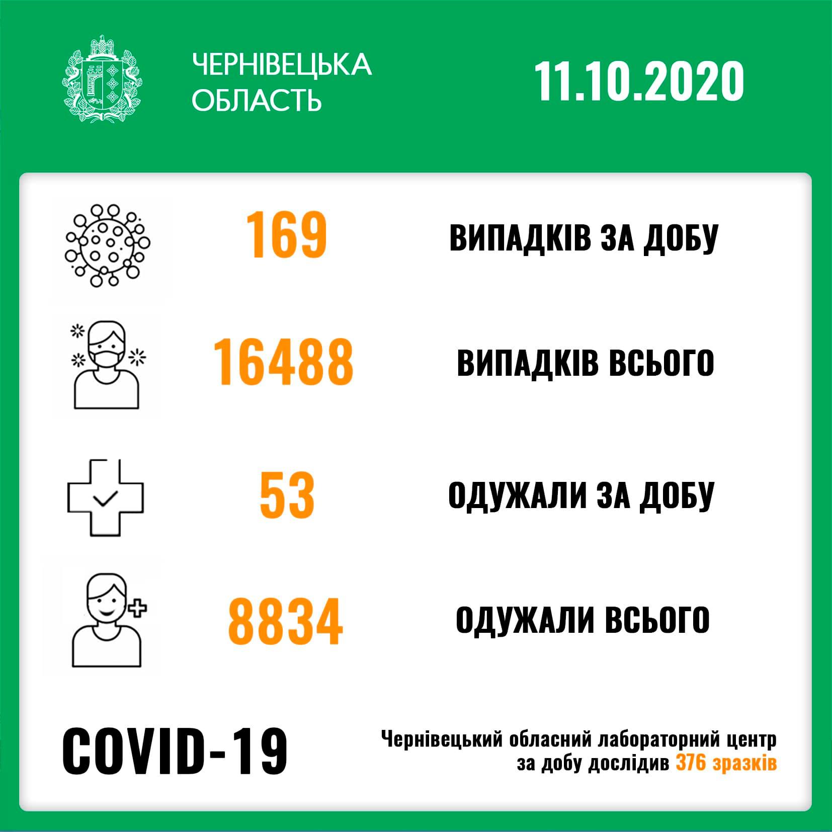 Станом на 12 жовтня у Чернівецькій області виявили 169 нових випадків COVID-19. Від моменту звістки про першого хворого інфікувалися вже 16 488 буковинців. Із них 8 834 людини вже одужали, а 53 — за останню добу.