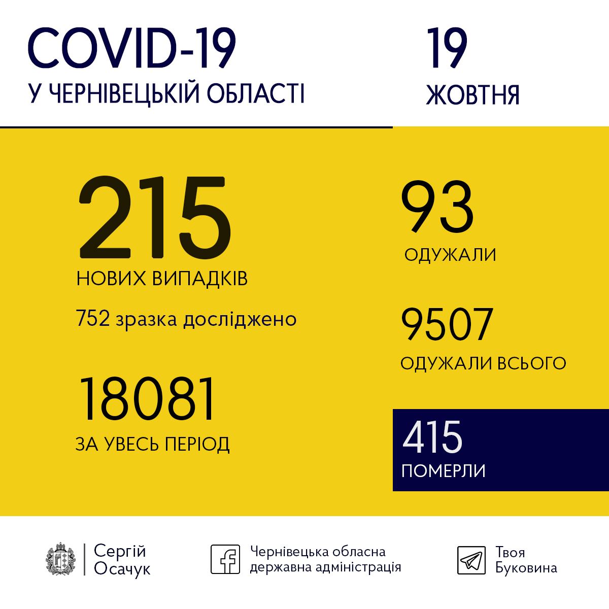 Станом на 20 жовтня у Чернівецькій області виявили 215 нових випадків коронавірусу. За весь період епідемії тут захворіла 18 081 людина. 9507 буковинців уже побороли недугу, 93 з них — за останню добу. Загалом від вірусу в області померли 415 осіб.