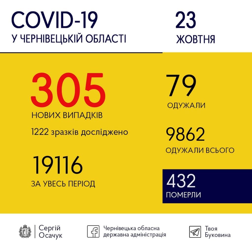 За останню добу у Чернівецькій області виявили 305 нових випадків COVID-19. Загалом тут захворіли 19 116 людей, а померли — 432. Вилікувалися 9862 буковинці, 79 з них — за останню добу.