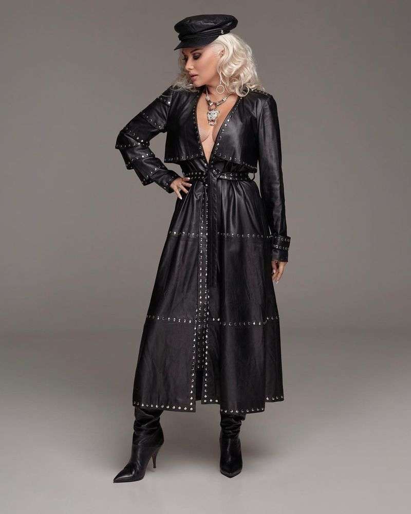 Українська співачка Катерина Бужинська приміряла зухвалий образ. Так, у фотоблогу артистка поділилася свіжими знімками, на яких постала у образі рок-діви, одягнувши шкіряний плащ із кнопками, високе взуття на підборах та стильний картуз. Катерина не одягнула під плащ спіднє та пікантно засвітила пишний бюст. Свій образ знаменитість доповнила ефектним мейком та масивними аксесуарами.