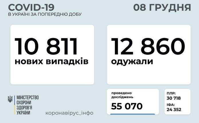 10 811 нових випадків коронавірусної хвороби COVID-19 зафіксовано в Україні станом на 8 грудня 2020 року. Зокрема, захворіли 520 дітей та 512 медпрацівників. Про це повідомляє телеграм-канал Коронавірус Інфо.